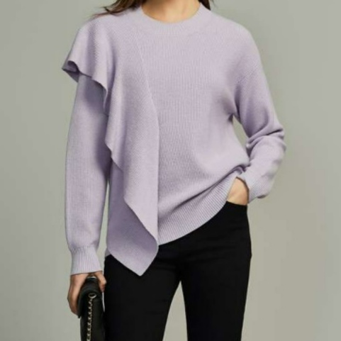 上品な光沢感のあるラベンダーカラーのニットは、フリルデザインが特徴的な一着です。