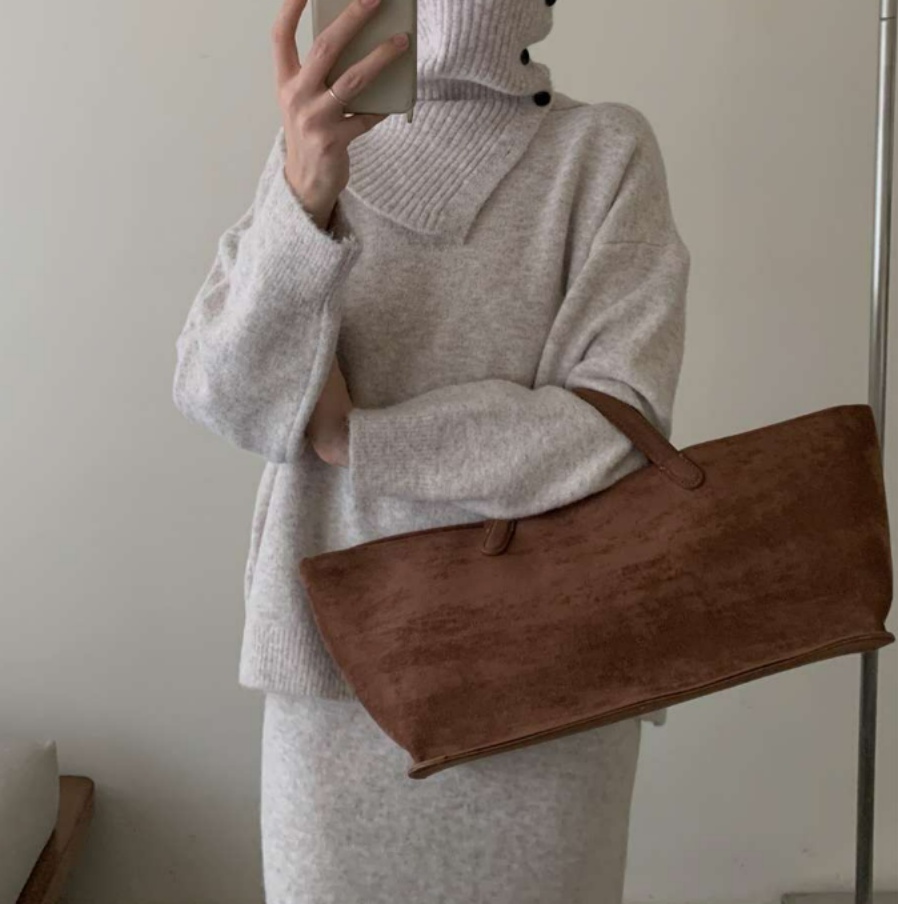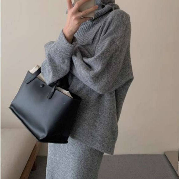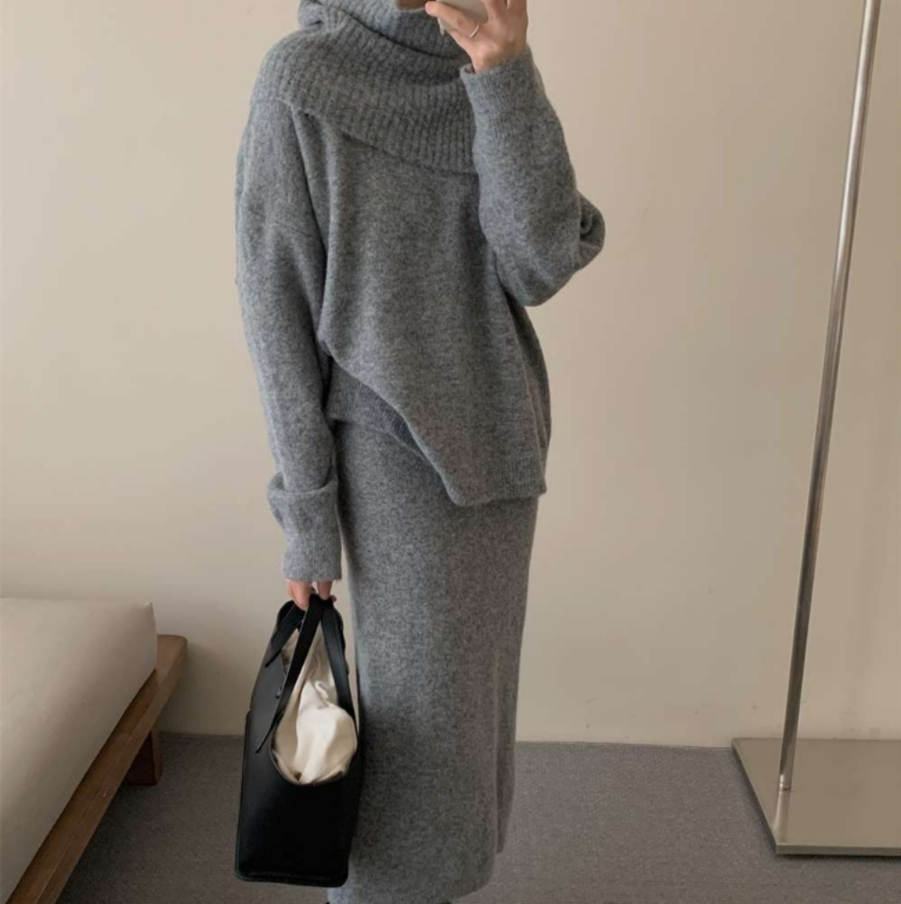 ハイネックデザインとミモレ丈スカートの組み合わせで、落ち着きのある洗練された雰囲気を演出