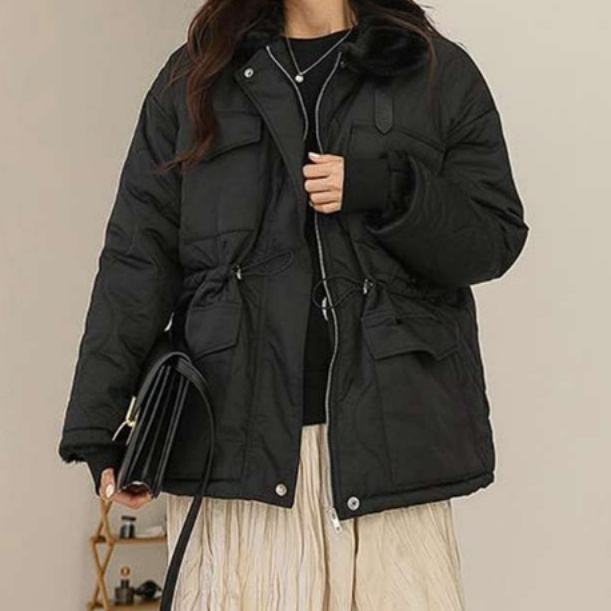 ボリュームのある襟元と裾のドローコードがアクセントの中綿ジャケット♪