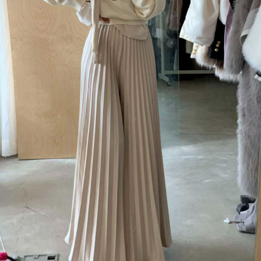 しなやかな素材で仕立てた、床までたっぷりと揺れるプリーツパンツ。