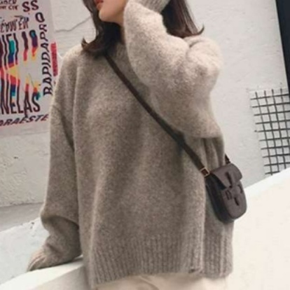 ドロップショルダーデザインで、リラックス感のある着こなしを演出。袖のボリューム感と首元のリブ編みがポイント。