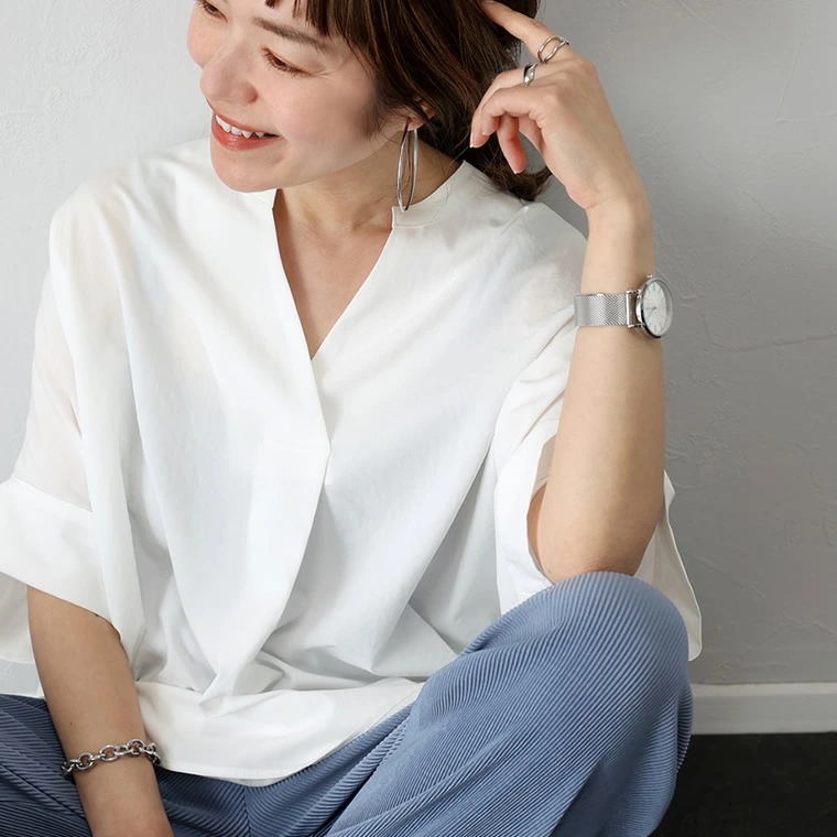 軽やかな着心地と重ねた生地感が優しい雰囲気を演出します。ブルベファッションに最適な涼しげな印象で、どんなボトムスとも相性抜群。