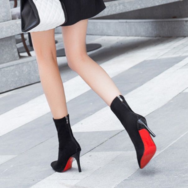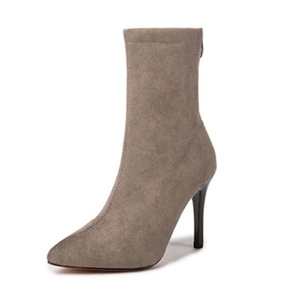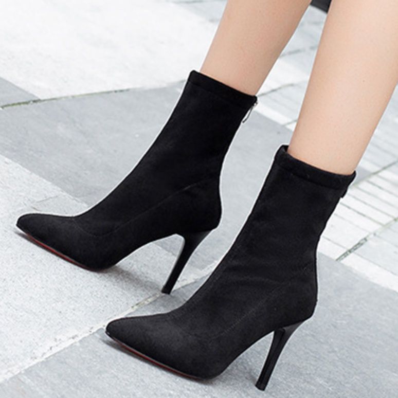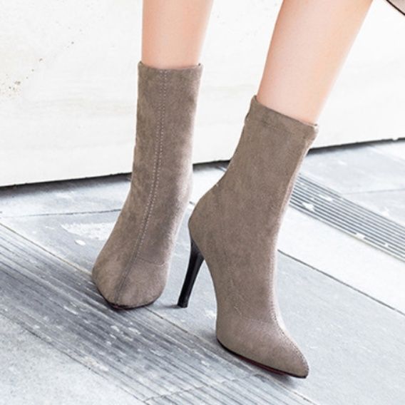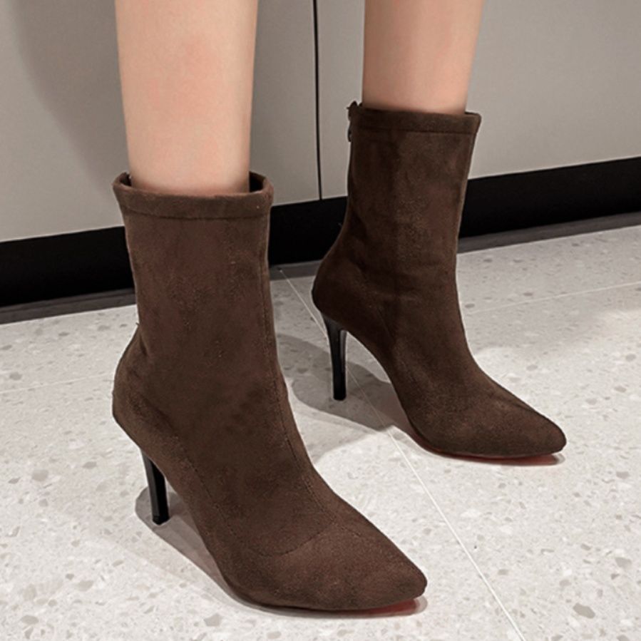 上品なスエード調素材の細ヒールブーティで、洗練された足元を演出します。