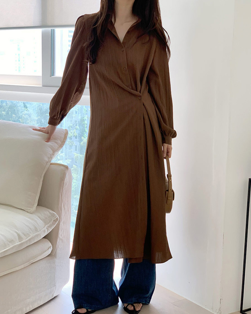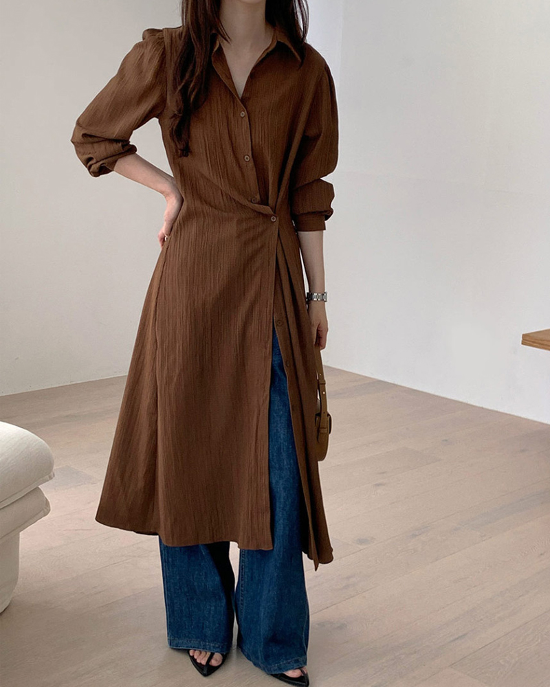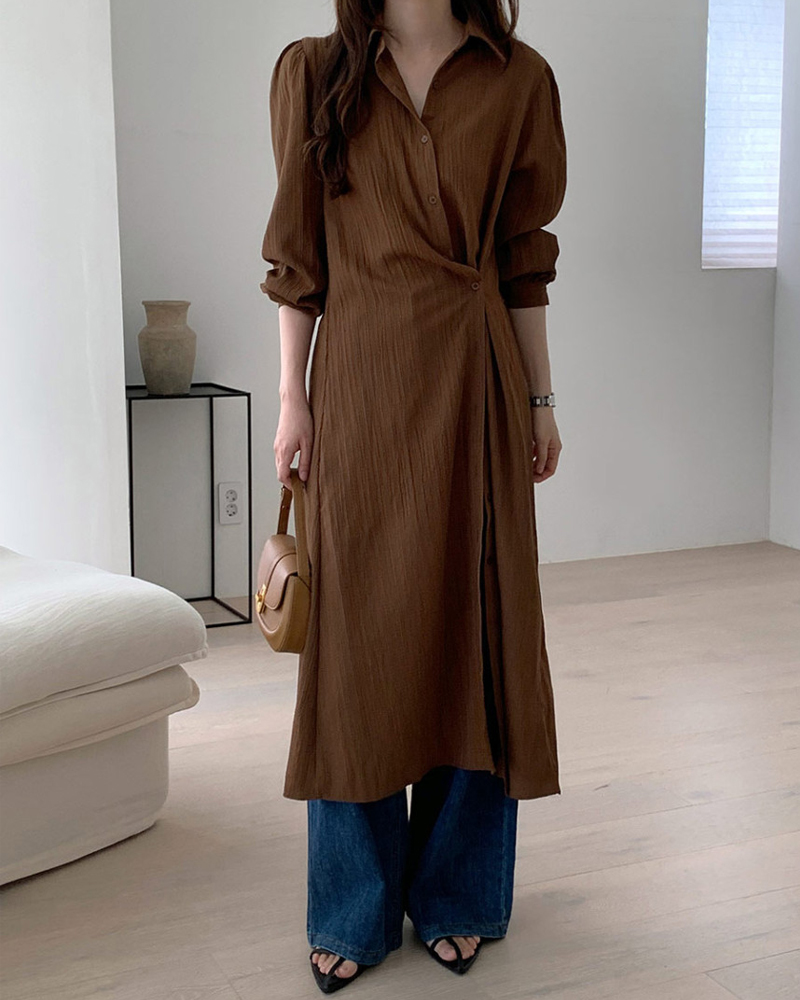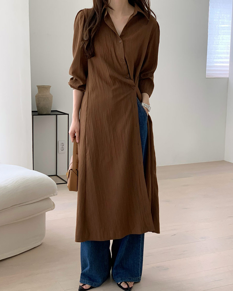 おしゃれなシャツ襟とサイドスリットが洗練された印象を与えます。
