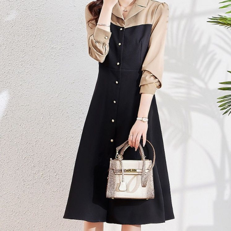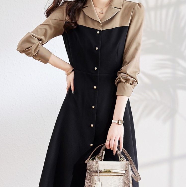 フロントのボタンがアクセントになり、膝丈のフレアシルエットが上品で女性らしい雰囲気を醸し出します。