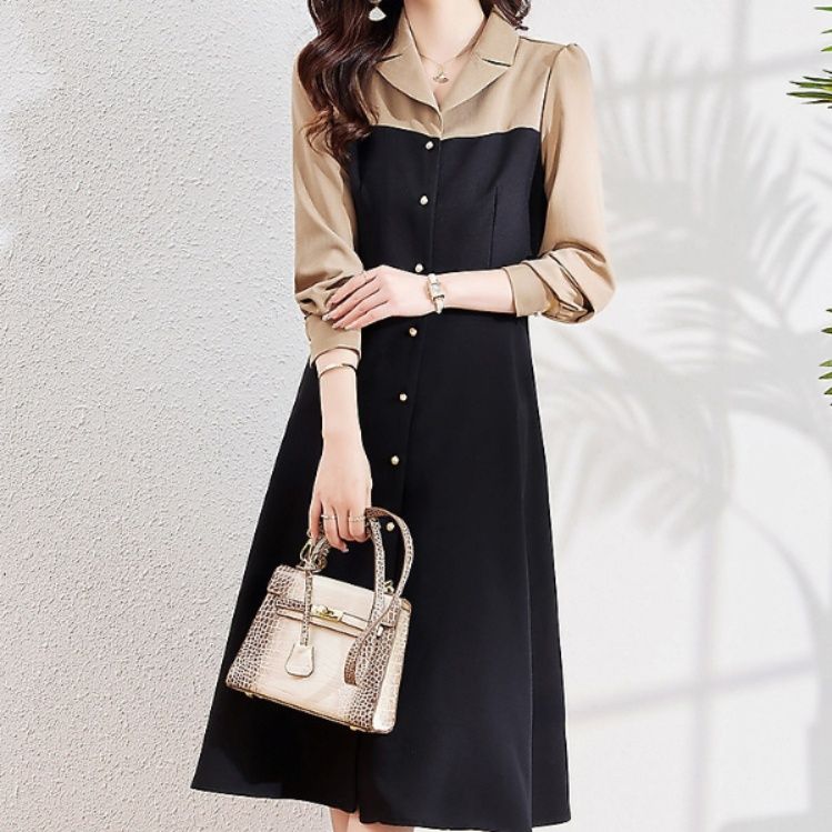 シャツ風の襟とワンピース部分の素材感の違いが、こなれた大人の雰囲気を演出