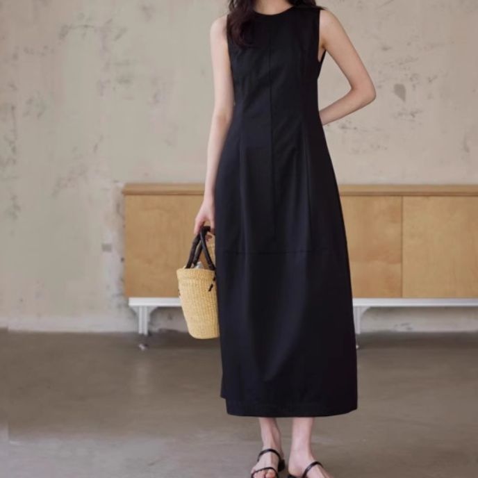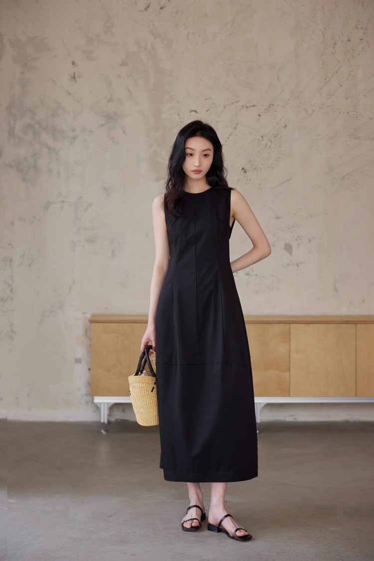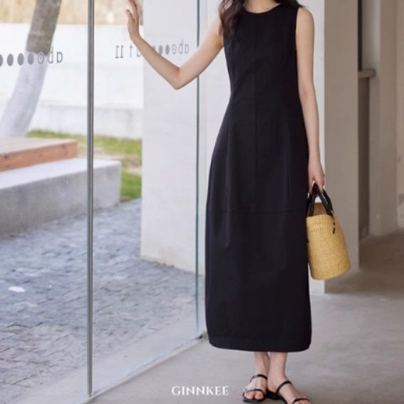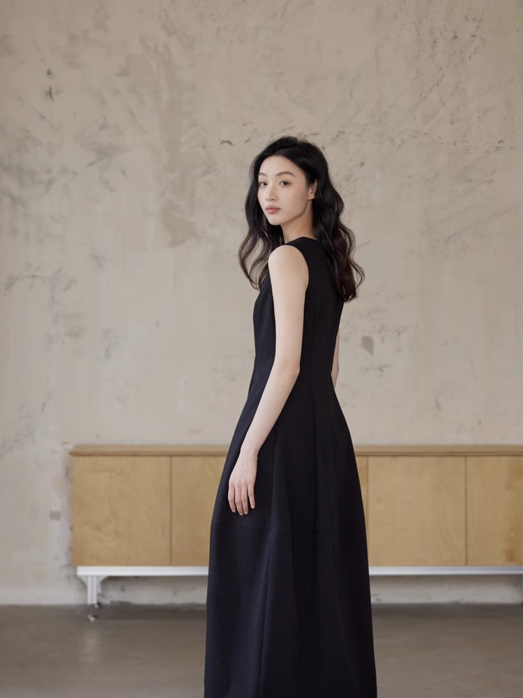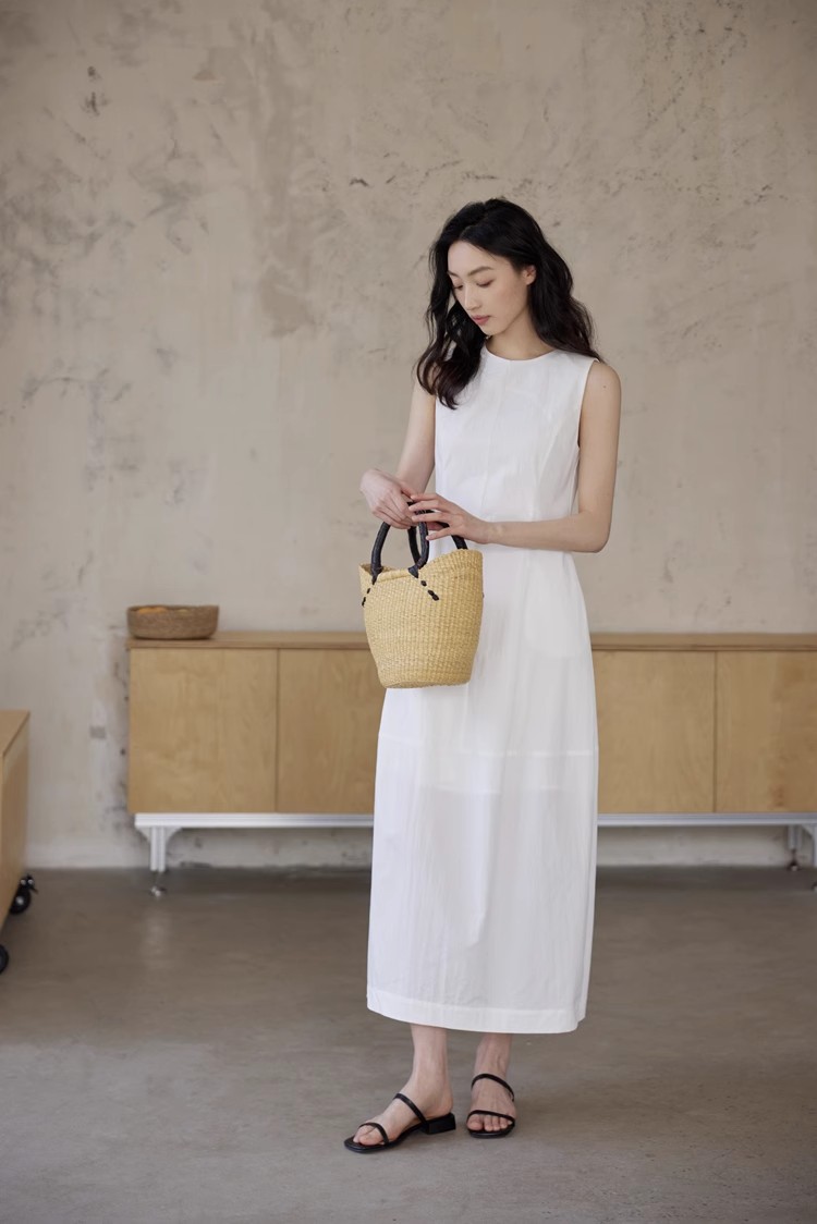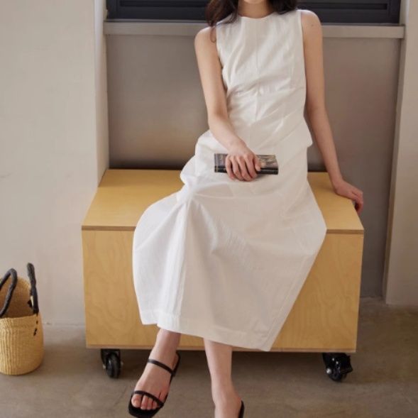 袖がない洗練されたシルエットで涼しげな印象を演出し、腕のラインを美しく見せる