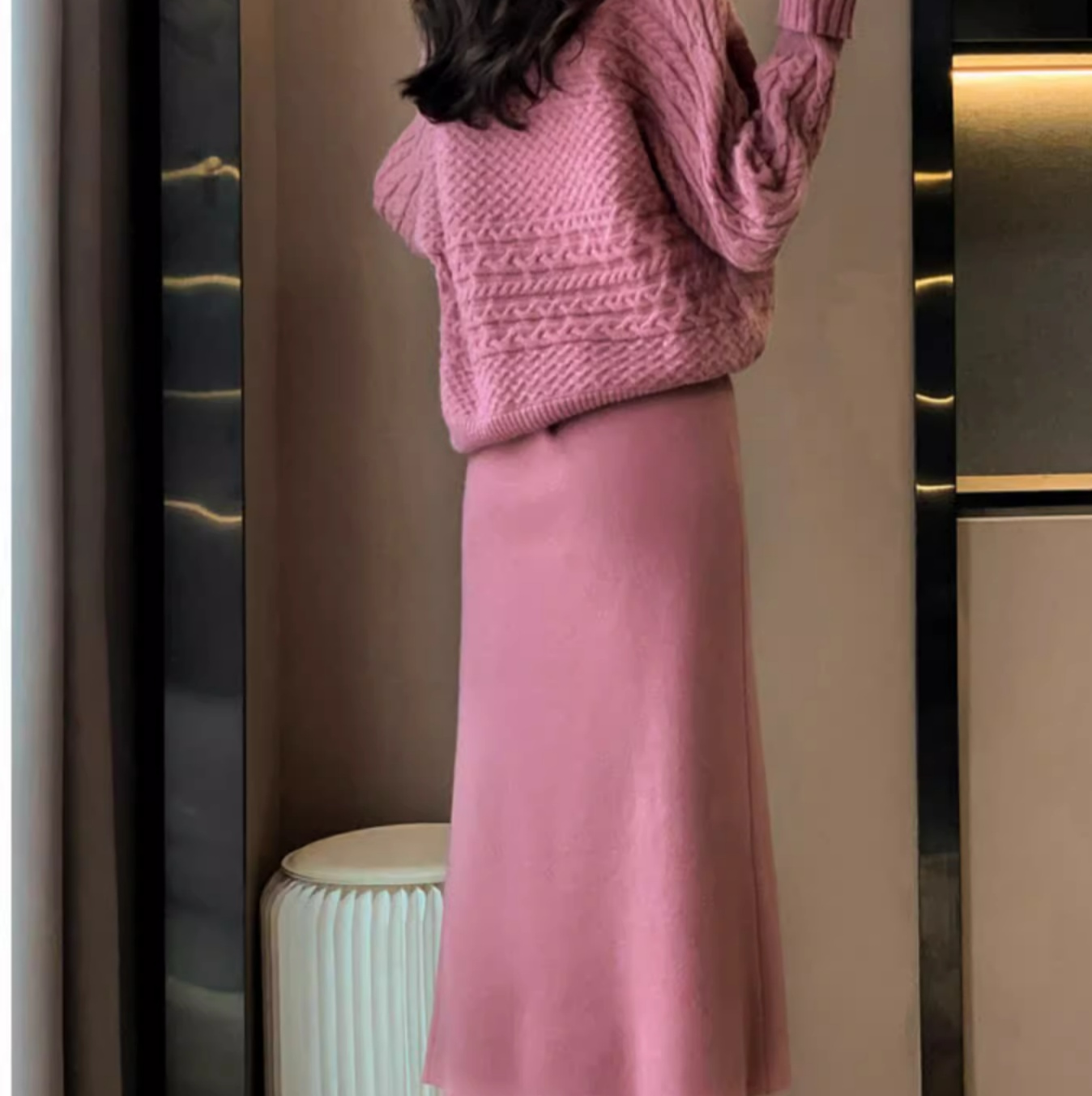 厚手で暖かいセーターと、ボタン付きストレートスカートの大人カジュアル2ピースコーデです。ブルベ夏さん、ブルベ冬さんの得意な暗めのピンクはおすすめです。