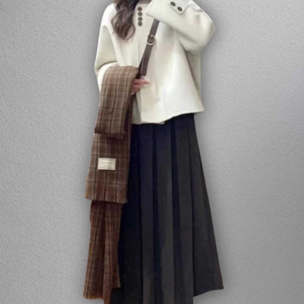首元にボタンが配置されたホワイトジャケットと、ブラックのロングスカート。シンプルなコーディネートで誰にでも似合うセットアップです。
